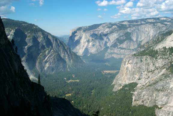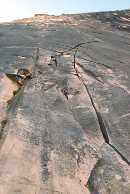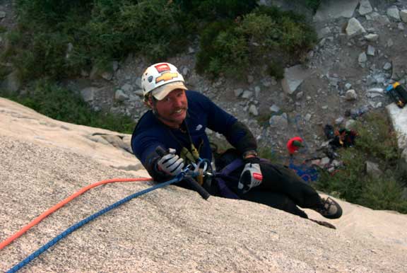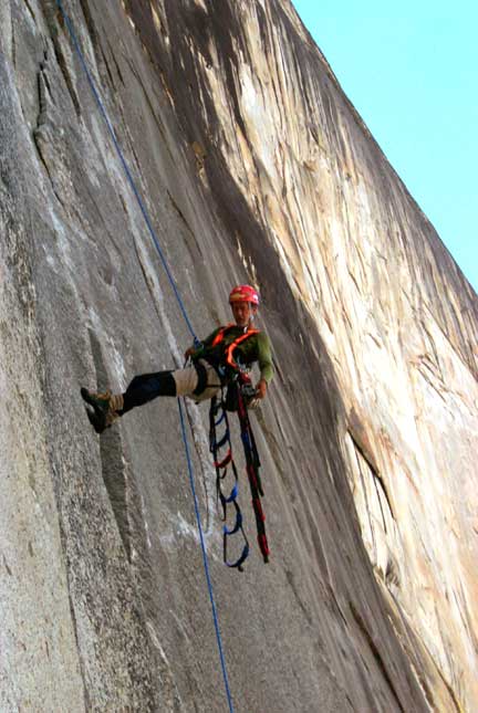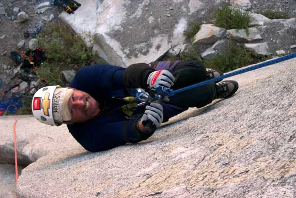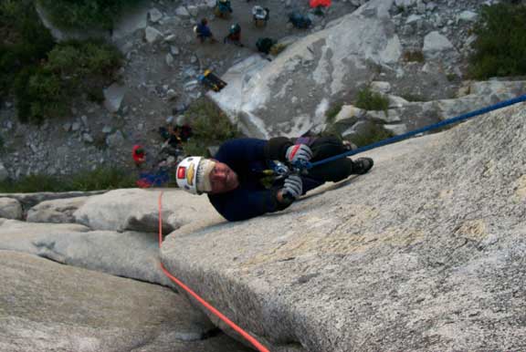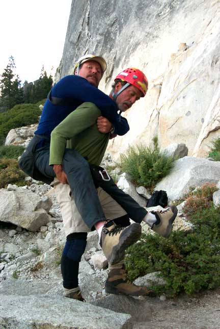 from day 2 Day 3, 9/6/01 Mike Corbett takes a 40' fall and possibly breaks ankle. The team is camping at the top of the 4th pitch and will be retreating off of the wall tomorrow. Mike Corbett took a 40 fall while leading the 5th pitch and has possibly broken his ankle. He was on some very bad gear on a sandy, gravely slopping ledge and fell off. Mark reported that it was a good thing Mike had a helmet on as he also hit his head. They will do a self rescue to the base of the climb and then make their way back up to the shoulder, about 1 mile up a steep hill, to the Half Dome cable trail. This could take awhile as Mark will have to be carried back up. At this point it is unclear how Mike will make up to the trail with his injured ankle, whether he can walk/crawl or will need some assistance from the support team. There they will take horses back to Yosemite Valley and Mike will head to the clinic. Day 4, 9/7/01 Everybody