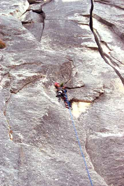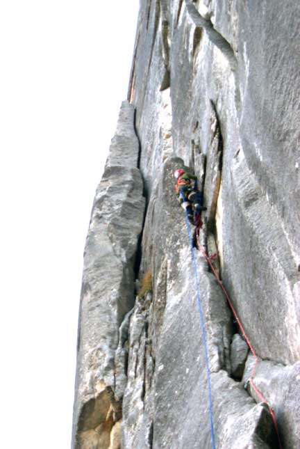 from day 1 Day 2, 9/5/01 It took awhile but they finally got all the gear sorted and packed at the base and started to climb. Perfect weather with some puffy white clouds and temps in 70s helped them along on this second day. They made it up into the crescent arch, a huge gaping body sized chimney crack which is 3 pitches up. Mike said it was very strenuous to crawl his way up this crack. The team was amazed when they saw 3 Peregrine falcons swooping across the wall. After setting up camp all were in bed at 8:30 after a tough day with lots more climbing ahead. Photos